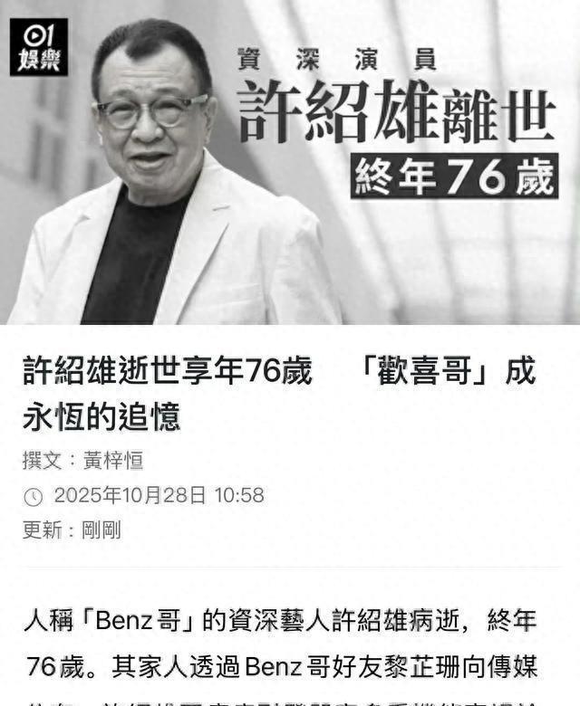 2025年10月28日凌晨一点零七分,养和医院心电监护拉成一条平直的绿线。护士把被单拉到许绍雄的下巴,像给一场戏做最后的收光。门口守着的人比颁奖礼还多,周润发把鸭舌帽压到最低,佘诗曼的睫毛膏糊成熊猫,谁都没说话——大家心里清楚,这位“金牌绿叶”杀青了,且没有彩蛋。肾癌→多器官衰竭,病历上只有八个字,却把77年的人生压成一张A4。可观众记住的,从来不是病历,而是角色:他叼着烟卷在《使徒行者》里叫“欢喜哥”,把黑道大佬演成隔壁阿叔;他穿着不合身西装在《新扎师妹》里喊“方中Sir”,一句“我升职啦”承包了整部片子的笑点统计表。有人统计过,他拍过200+角色,平均每年4.2个,产量高过肯德基出新品,且从不串味——演警察就自带交通灯一样的正义感,演混混连牙缝里都塞着市井气,这才是真正的“剧抛脸”。